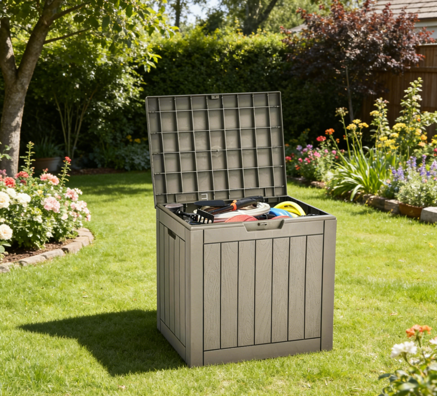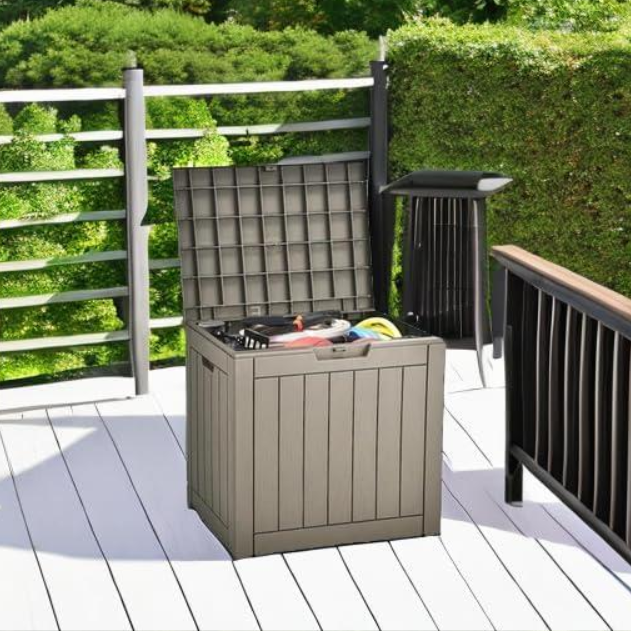 The box is suitable for storing patio furniture cushions, pool accessories, garden tools, and other outdoor items. The waterproof construction is intended to protect contents from weather conditions. This unit is intended for placement on patios, decks, or in garden settings.