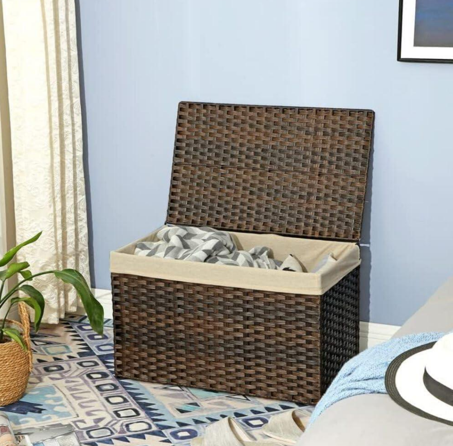 This storage bin offers a capacity of 160.1 litres and is constructed with a woven exterior and an internal metal frame to maintain structural integrity. The unit is supplied with a lid and includes a removable liner. Handles are fitted to assist with transportation.