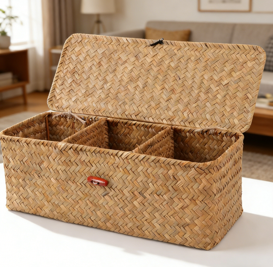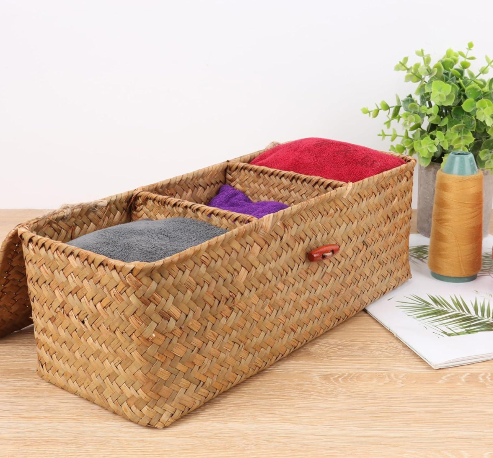 Rectangular Seagrass Storage Baskets with Dividers and Lid